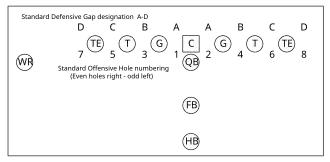 The gaps on either side of the offensive center and between the guards are called "A" gaps.[4][5][6][7][8] A gap between the offensive guard and tackle is called a "B" gap. The gaps outside the offensive tackle are called "C" gaps. If there is a tight end, the gap outside the tight end and opposite the tackle is a "D" gap.