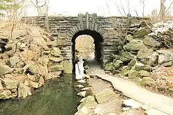 1859[53] | Center Drive | Pedestrian path | 24 feet (7.3 m) | 65 feet (20 m) | 11 feet (3.4 m) | Driprock Arch carries Center Drive over what was formerly a bridle path,[53][54] and before that, the former course of a mill stream that ran into what is now the Pond.[55] The bridle path was demolished in the 1930s when Heckscher Playground was expanded, and a pedestrian path now passes underneath Driprock Arch. The arch contains a red-brick vault, spandrels, and revetments, as well as sandstone trim.[53][56] There are sandstone rosaries set into the vault's ceiling.[55] |