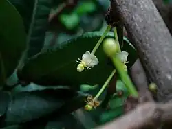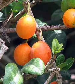 It is an evergreen small tree, growing to 6–18 m tall. The leaves are borne in opposite pairs or whorls of 3–4, each leaf blue-green, oval, 6–11 cm long and 3–5.5 cm broad. The flowers are produced in clusters on the stems. The fruit is a small, bright, orange, thin-skinned berry 1–4 cm diameter, with one single large seed; the small yield of edible fruit is pleasantly sweet, yet acidic, but also containing a latex that some people find unpleasant.[3][4]