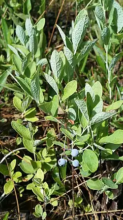 Gaylussacia nana is a shrub up to 1 m (40 inches) tall, sometimes forming large colonies of hundreds of individuals. It has dull green to yellow-green leaves up to 4 cm (1.6 inches) long. Inflorescences hang from the leaf axils or from the tips of branches, with 1-4 greenish-white flowers. Fruits are sweet and juicy, usually dark blue but sometimes white, up to 8 mm (0.3 inches) in diameter.[5][6]