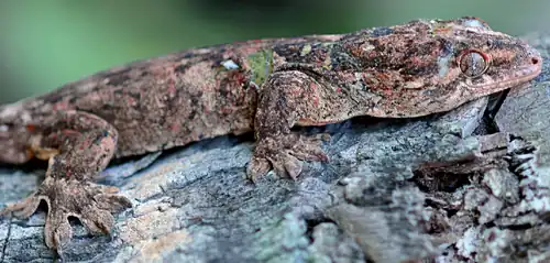 A large, stoutly built gecko. The size from snout to vent is 112 millimetres (4.4 in), plus the tail length of 75 mm (3.0 in). It has a brown color with five dark brown saddle patches between forelimbs and base of tail. The ventral side is light brown with a yellow hue. Iris is brown. The color can vary by showing yellow, reddish and olive elements. The tail has five to six dark bands, which are especially distinct in juveniles and less distinct on adults. Males grow larger than females and have precloacal-femoral pores. Like most geckos, they are oviparous, i.e. reproduce by laying eggs.