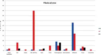 Female gravesites of all ages at Osteria dell'Osa unanimously contain items that were likely considered feminine within Latial society, many of which are seemingly personal accoutrements. Fibulae are among the most common feminine ornaments for all age groups in Osteria, although children's fibulae are typically smaller than fibulae uncovered in adult burials.[18] Arch fibulae, specifically, are associated with female burials across multiple Latial sites, such as Tivoli, Ardea, and Osteria.[19] However, in Rome, arch fibulae appear almost evenly distributed across male and female burials, perhaps indicating that the item was not associated with any particular gender.[19] Moreover, arch fibulae samples occur alongside both textile tools, a typically feminine burial good, and helmets or razors, which were usually masculine funerary items. Cecilie Brøns, a classical archaeologist, doubts whether fibulae-type was directly related to gender in Latial culture, citing the cooccurrence of arch fibulae with both male and female burial objects.[17]