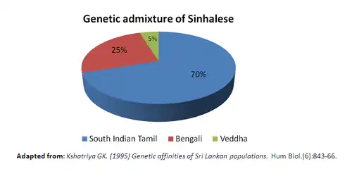 A genetic admixture study by Kshatriya (1995) found the Sinhalese to have a higher contribution from Indian Tamils (69.86% +/- 0.61), compared with the Bengalis (25.41% +/- 0.51).[8]