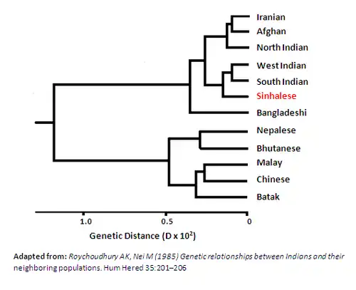 A 1985 study conducted by Roychoudhury AK and Nei M indicating the values of genetic distance showed that the Sinhalese, along with the four Indian subcontinent populations from Punjab, Gujarat, Andhra Pradesh, and Bangladesh, were closer to Afghans and Iranians than the neighboring East/Southeast Asian groups represented by the Bhutanese, Malays, Bataks in northern Sumatra, and the Chinese.[9]