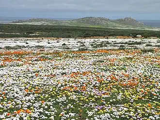 Namaqualand is popular with both local and international tourists during early springtime (August - September), when for a short period this normally arid area becomes covered with a kaleidoscope of colour during the flowering season. This is known throughout South Africa as the Namaqualand daisy season, when orange and white daisies, as well as hundreds of other flowering species, spring up from a previously barren landscape.[12] A part of Little Namaqualand, known as the Richtersveld, is a national park and a World Heritage Site, while the often-visited Namaqua National Park and the Goegap Nature Reserve are located short distances from Kamieskroon and Springbok, respectively.