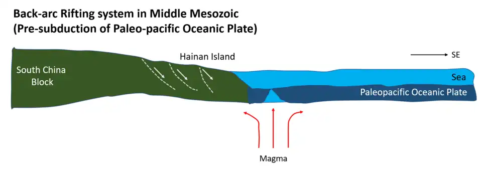 In Middle-Jurassic, Hainan Island was in place at the back-arc rifting system.[16] Until Early Cretaceous, the Paleo-pacific oceanic plate was then subducted under the South China Block in the northwest.[16] As a result, the intrusive activities took place frequently as well.