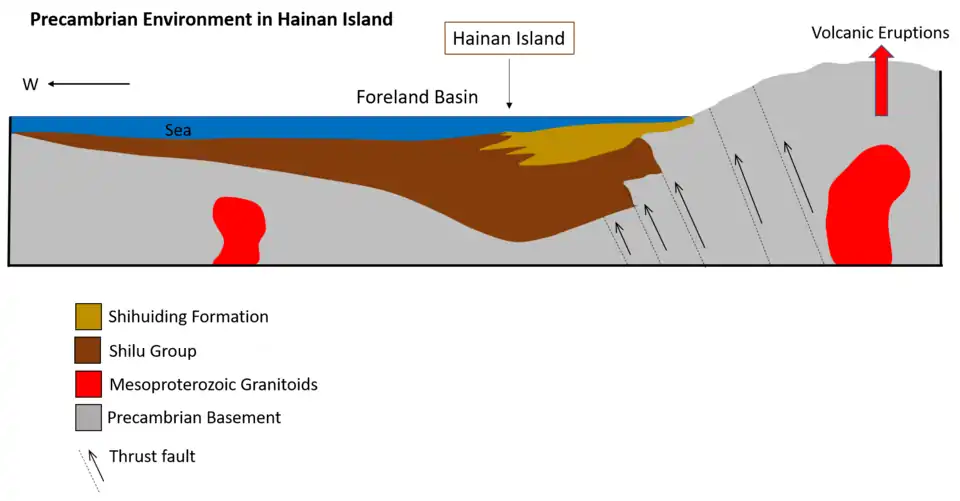 Conformably lying above the Shilu Group was the Shihuiding Formation which was generally low-grade, siliciclastic rocks deposited in foreland basin.[7] The sedimentation took place in the period between Late Mesoproterozoic and Early Neoproterozoic. The rocks were then regionally metamorphosed in the late South China Jinningian event.[1]