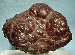 Iron mineralisation, in the form of haematite veins, occurs across the northern and western Lake District, hosted particularly in the Skiddaw Group slates. It is typically of the form known as "kidney ore" with most of the veins being almost pure haematite. The most significant haematite mineralisation, however, is in the form of large orebodies replacing Carboniferous limestone in the West Cumbrian iron orefield on the western margin of the Lake District. The similarities between the orebodies hosted in the limestone and those in the Ordovician rocks suggests that they were formed together.[17] The most likely source for the iron is the Permo-Triassic sequence that lies to the west of the Lake District in the East Irish Sea Basin. Orebodies are concentrated wherever Carboniferous limestone is in direct contact with permeable Permo-Triassic rocks. The same iron-rich fluids moving eastwards away from the basin within the sedimentary cover sequence would then have had access to open fractures in the Ordovician rocks, forming the vein deposits there.[18]