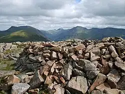 The Skiddaw Group are the oldest rocks known from the Lake District. They are mainly Ordovician in age, from possibly Cambrian up to Llanvirn (upper middle Ordovician). The sequence, which is up to about 5 km in thickness, consist mainly of mudstones and siltstones, with lesser amounts of sandstone.[2] Following deformation and low-grade metamorphism during the Acadian Orogeny, they now have a well-developed slaty cleavage, giving rise to their common name, the Skiddaw Slates. The group is divided into two main areas, the northern and central fells, to either side of the WSW-ENE trending Causey Pike Fault, with distinct successions developed.[3]