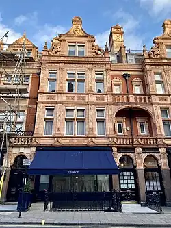 Upon opening in 2001 the "cool section" of George was the "one farthest from the front door". Birley, Cosima von Bülow and the art dealer Harry Fane were seated there on opening day.[2] The downstairs of George has a bar described by Birley as a "nighterie ... not a nightclub. You move downstairs at the end of dinner, sit around on sofas, have a drink, and listen to a little bit of music".[2] A red private dining room seats 12.[2] The George Private Bar opened in the basement of George in 2005.[7] The George Private Bar was established by Birley's son, Robin, and his sister, India Jane, who ran Birley's clubs during his ill health.[7]