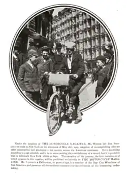 On July 6, 1903, Wyman arrived in New York City, completing his transcontinental crossing and becoming the first person to cross the North American continent aboard a motor vehicle.[13] His journey took a total of 51 days to cover some 3,800 miles (6,100 km). Afterwards, Wyman's motorbike was placed on display at the New York Motorcycle Club while Wyman recovered from his grueling journey. While in New York, Wyman was present for the inauguration of the very first nationwide motorcycle organization, the Federation of American Motorcyclists (FAM)[14] at the Kings County Wheelmens' Club in Brooklyn; it was reported at the time that his hands were still in bandages from the trip.[15] Wyman later returned to San Francisco by train. His California motorbike was put on display in San Francisco at Golden Gate Park for a special exhibition commemorating the trip.