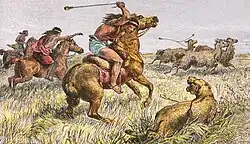 Wáki killing a Puma, illustration from At Home with the Patagonians by George Chaworth Musters