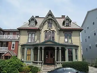 The house is set in a predominantly residential area just west of Worcester's central business district, on the north side of William Street. It is a 2+1⁄2-story wood-frame house, with a slate hip roof, slightly projecting central gabled pavilion, clapboard siding, and a granite foundation. Its front facade, facing south, is three bays wide, with single-story polygonal bay windows flanking the entrance. The entrance, set in the projecting pavilion, is sheltered by a porch that extends between the near corners of the flanking bays, with supporting square columns, arched openings, and a low balustrade. On the second level, a three-part round-arch window is set above the entrance under a stylized cap. The gable of the projecting section has Stick style bargeboard, and is flanked at the roof level by gabled dormers with a simplified version of the same decoration. Windows on the side elevations have bracketed sills and lintels, with the first-floor lintels capped by gabled cornices, and those on the second floor flat. A two-story polygonal bay projects from the right side, just below a steeply pitched gable.[2]