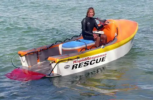 While tinkering with surfboard designs, Greenough also experimented in boat hull design. While living in California he redeveloped the American Boston Whaler hull to suit his particular needs, which included capsize resistance and open ocean mishandling flaws such as pearling and broaching. He designed a modified cathedral type hull and has used this design to build a number of beach-launchable and offshore fishing boats for himself for use both in America and Australia. He built a 15 foot version in Australia which he rigged with a camera boom for filming his movie Dolphin Glide. His hull design is an exceptionally good performer in the rugged surf experienced on the Australian coastline, and it allowed him to follow and film pods of Dolphins through the breaking surf without fear of mishap. His next development was an expanded jet-ski type watercraft which was intended as a Rescue Craft in the hopes the Surf Life Savers New South Wales (SLSNSW) would pick it up as a replacement for their current fleet of jet skis, but little interest was shown by the SLSNSW. He has since used this boat primarily for fishing the reefs offshore Eastern Australia. This ocean craft design, known as the GARC (Greenough Advanced Rescue Craft), was a product he developed to perform rescue missions in the breaking surfline and on the open ocean. The GARC is currently manufactured by MAPC (Maritime Applied Physics Corporation), which holds the patents for the craft.[14] This jet-ski look-alike is a more rugged and stable version that can be launched in the waves or by an aircraft. The development of the open transom and the stern tongue make it possible for rescues without having to actually lift the person in trouble out of the water. The GARC holds four people and will be used by the United States Navy, Coast Guard, and National Guard.
