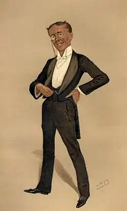 Grossmith had become the most popular solo entertainer of his day, and his tours earned him far more than he had earned while performing with the D'Oyly Carte Opera Company.[1] He also continued to compose music, including the comic opera Castle Bang (1894) and the sketches The Ibsenite Drama (1895) and Do We Enjoy Our Holidays? (1897) and songs like "The Baby on the Shore" (1893), "Johnnie at the Gaiety" (1895), "Tommy's First Love" (1897), and "The Happy Old Days at Peckham" (1903).[33] In 1894–95, however, Gilbert enticed Grossmith to take the role of George Griffenfeld in His Excellency, with music by Frank Osmond Carr. Also in 1897, he played briefly as King Ferdinand V of Vingolia in F. C. Burnand's His Majesty at the Savoy Theatre and made two more short London stage appearances thereafter, as Scoones in Young Mr Yarde (1898) and Lambert Simnel in The Gay Pretenders (1900).[11][44] An 1896 interview of Grossmith reveals him feeling his age and considering the end of his touring career, while enjoying time spent at home with his family, dogs and antique piano collection.[45]