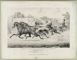 George M. Patchen, Brown Dick, and Miller's Damsel competed in a trotting race for a $500 purse at Union Course, Long Island, on July 7, 1859. The race was commemorated in a lithograph by Currier & Ives.[8] Sporting men and horse enthusiasts eagerly watched as George M. Patchen met Ethan Allen in 1860 at Union Course for a $2,000 harness race, best three out of five heats.[9] During that season, he twice beat Ethan Allen (2:25½) and Flora Temple (2:19¾), though she bested him nine times that season. In one of their matches at the Union Course, he won a heat in 2:23½—the fastest mile ever by a trotting stallion at the time.[4] Before his second two-mile heat in harness at Philadelphia's Suffolk Park in 1860, George M. Patchen was sold. The buyer was William Waltermire, a New York cattleman, who paid $20,000 to Joseph Hall.[10]