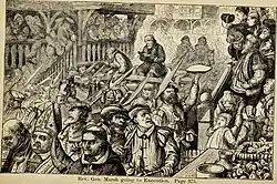 A warrant was issued for Marsh's arrest for heresy by Edward Stanley, 3rd Earl of Derby. Justice Barton of Smithills Hall in Bolton sent servants to arrest him at his mother's house, but Marsh gave himself up at the hall. After being "examined" at Smithills, according to local tradition, Marsh stamped his foot so hard to re-affirm his faith that a footprint was left in the stone floor.[3] While being questioned at Lathom House by the Earl of Derby it was thought that he could be made to conform and he was held in reasonable comfort. Marsh, however resisted the efforts to make him submit and when he refused recant was taken to Lancaster Gaol where he was brought for trial at the Quarter Sessions. For nearly a year, Marsh remained in Lancaster Gaol where he read from the Bible and prayed with townsfolk gathered outside his window until George Cotes, the Catholic Bishop of Chester intervened. Sympathisers offered support and priests tried to convert him. When statutes against heresy were enacted by parliament Marsh was taken to the gaol at Northgate, Chester.[1][4] He stood trial under Bishop Cotes in the Lady Chapel of Chester Cathedral.[5] Marsh refused to convert to Roman Catholicism, despite being given one last chance to recant while being tied to the stake at which he was about to be burned.[6] His imprisonment is documented in Foxe's Actes and Monuments.[7] Marsh's follower and brother-in-law Geoffrey Hurst, a Shakerley nail maker, was also imprisoned at Lancaster but was saved from execution by Queen Mary's death.[1]