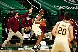 Ronald Polite dribbles the ball from George Mason vs. Fordham at Eagle Bank Arena, 2021