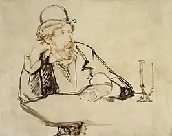 In 1868, Moore's father was again elected MP for Mayo and the family moved to London the following year. Here, Moore senior tried, unsuccessfully, to have his son follow a career in the military though, prior to this, he attended the School of Art in the South Kensington Museum where his achievements were no better. He was freed from any burden of education when his father died in 1870.[12] Moore, though still a minor, inherited the family estate that generated a yearly income of £3,596. He handed the estate over to his brother Maurice to manage and in 1873, on attaining his majority, moved to Paris to study art. It took him several attempts to find an artist who would accept him as a pupil. Rodolphe Julian, who had previously been a shepherd and circus masked man, took him on for 40 francs a month.[13] At Académie Julian he met Louis Welden Hawkins who became Moore's flatmate and whose trait, as a failed artist, shows up in Moore's own characters.[12] He met many of the key artists and writers of the time, including Pissarro, Degas, Renoir, Monet, Daudet, Mallarmé, Turgenev and, above all, Zola, who was to prove an influential figure in Moore's subsequent development as a writer.