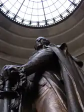 As Vincennes grew in the 1800s, it overran the site of Fort Sackville and its boundaries were lost. In 1905, the Daughters of the American Revolution placed a stone marker on what they believed was the location of the fort. In 1929, local residents made a major effort to commemorate the 150th anniversary of Clark's campaign. The state of Indiana chose to build a memorial to General Clark's triumph in the 1930s, with the assistance of the United States government; the various funds amounted to $2.5 million. The memorial was designed by New York architect Frederic Charles Hirons and dedicated June 14, 1936, by President Franklin Roosevelt.[5][6] Though the National Park Service in 1976 called the finished memorial the "last major Classical style memorial" constructed in the United States, the New York State Memorial to Theodore Roosevelt at the American Museum of Natural History by John Russell Pope was also completed in 1936, and Pope's Jefferson Memorial in Washington, D.C. was completed 1939–1943, are of the same era.[7]