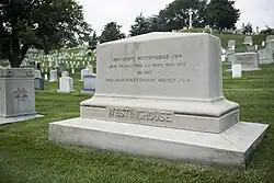 George Westinghouse remained a captain of American industry until 1907 when the financial panic of 1907 led to his resignation from control of the Westinghouse Electric company. By 1911, he was no longer active in business, and his health was in decline.[64] Westinghouse died on March 12, 1914, in New York City at age 67. He was initially interred in Woodlawn Cemetery, Bronx, NY then removed on December 14, 1915. As a Civil War veteran, he was buried in Arlington National Cemetery, along with his wife Marguerite, who survived him by three months. She had also been initially interred in Woodlawn but removed and reinterred at the same time as George.[65]