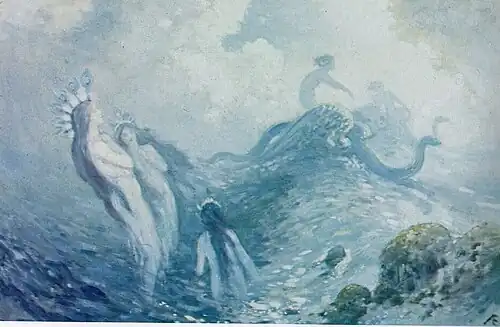 He claimed to see nature spirits and made paintings about them, such as the sídhe, elven or faerie beings in Irish folklore.[19][20] On one occasion, he showed some drawings he had made of them to a peasant, who would have pointed out that he had already seen many of those entities.[20] In 1889 he had traveled with W. B. Yeats to a town in County Galway, where Russell also painted these spirit beings, and a Druid is said to have appeared to them in vision.[21] The previous year, in a letter to Yeats, Russell had stated: