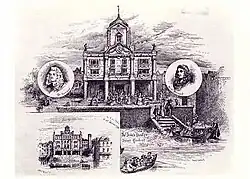 An 1875 postcard from the Victoria and Albert Hall showing the Duke's Company theatre in Dorset Gardens (the so-called "machine house") in operation from 1671 to 1709, which began as a playhouse and gradually became a house for spectacle.