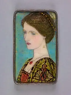 The Gaskins were leading jewellers of the Arts and Crafts movement,[4] mostly in the Birmingham area. In 1899 the Gaskins started producing jewellery together, under the name of Mr and Mrs Arthur Gaskin. Despite having no technical expertise initially, they learnt many skills and employed others where necessary.[1] Georgie designed all of the jewellery that they made together,[1] though both were involved in making it.[2] They produced silver and enamel work, book illustrations and jewellery both independently and in partnership. Georgie's jewellery was initially quite simple, consisting of silver wirework set with coloured stones and enamel, as time went on it became more ornate, often being set with gems by the time of the First World War. She continued to design jewellery until shortly before her death.[1]