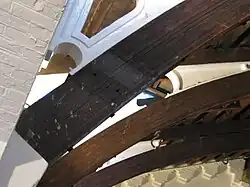 Laminated roof timbers showing cast-iron fillets and supporting brickwork.