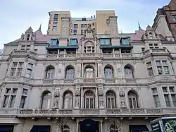 On the 72nd Street elevation, the first floor has storefronts (similar to those on Madison Avenue), and the entire width of the facade is curved at the second and third floors.[19] On both stories, the second and third stories are composed of rectangular windows, which are divided by vertical transoms and horizontal mullions made of stone. The center window on each story is a triple window, which in turn is flanked by one double window on either side. There are friezes with cartouches below the second-story windows, as well as putti and foliate panels below the third-story windows. The fourth and fifth stories have a double-height dormer, similar to the one at the center of the Madison Avenue elevation.[17]