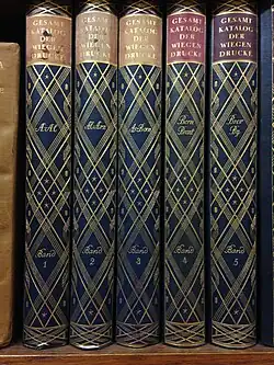 Der Gesamtkatalog der Wiegendrucke (English: The Union Catalogue of Incunabula (abbreviated as GW or GKW) is an ongoing project of the Berlin State Library and appears in conjunction with the print edition of the union catalogue of incunabula.[1] The Gesamtkatalog serves as a bibliography or collection of cradle prints or incunabula. The word incunabula stems from the Latin word incunabulum (place of birth or beginning). In the world of books, incunabula refer to books that were printed using metal type up to the year 1500.[2] The work is based on the description of the individual prints, each complete description consists of the bibliographic note, the collation, the description in the narrower sense, the source, and the copy.[3] The database contains all together 36,000 descriptions of incunabula, distributed over at least 3,900 articles.[4] The Gesamtkatalog der Wiegendrucke is available in part in print and in its entirety—in draft form—via an online database.