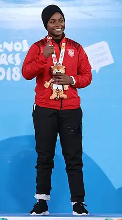 Ghofrane Belkhir (born 11 August 2001)[1] is a Tunisian weightlifter. She won the gold medal in the women's 55 kg event at the 2021 World Weightlifting Championships held in Tashkent, Uzbekistan.[2][3] She also won the gold medal in the 58 kg event at the 2018 Summer Youth Olympics held in Buenos Aires, Argentina.[4][5][6] Belkhir broke the world record for the snatch, clean and jerk, and total in the women's 59-kilogram class weightlifting event at the 5th International Solidarity Weightlifting Championship in Cairo, Egypt in December 2018.[7] As of May 2020, she holds the African junior records for these events in the women's 59 kg weight class.