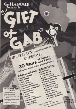 Gift of Gab is a 1934 black-and-white film released by Universal Pictures. Edmund Lowe stars as a man with the "Gift of Gab"—he can sell anyone anything. The film costars Ruth Etting, Ethel Waters, Victor Moore, and Gloria Stuart, and features Boris Karloff and Béla Lugosi. The film's sets were designed by the art director David Garber.