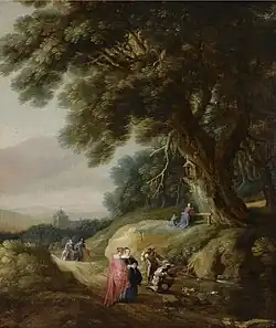 One of the earliest recorded work is the Landscape with Watermill (Rijksmuseum) dated 1633. In its blue-green hues it resembles the work of his contemporary Flemish landscape artists such as Lucas van Uden.[5] His earlier landscapes representing mountains with spruce of the 1630s are characterised by their tonal palette and small figures.[1] These early works seem to be closer to the travel landscapes of the Flemish painter Paul Bril, which depict imaginary experiences in a southern landscape, than to the Baroque of Peter Paul Rubens with its clear colours and bright light.[6][7] In the 1640s his horizons become deeper and his colours richer.[1] A Wooded rocky landscape with a couple tending sheep (Christie's, 14 November 2007 in Amsterdam, lot 191) of 1652 (but possibly 1632) is a typical example of his small-scale working style. Unlike contemporary Dutch landscapes, which strived for realism, the landscapes of Peeters are artificial and contrived and are intended as a form of poetry rather than a realistic document. With their candy-like colours, picturesque buildings and feathery trees they seem to anticipate the Rococo idyllic visions of a François Boucher hundred years later.[6] Some of his landscapes such as those he made in Brazil (for example View of Pernambuco de Recife) are more topographical in nature.