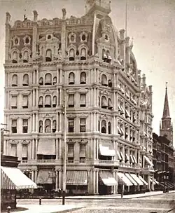 Gilsey House was designed by Stephen Decatur Hatch for Peter Gilsey, a Danish immigrant merchant and city alderman[2] who leased[2] the plot – which included the grounds of the St George's Cricket Club – from Caspar Samlar for $10,000 a year.[2][3][4][1] It was constructed from 1869 to 1871 at the cost of $350,000,[1] opening as the Gilsey House Hotel in 1872.[4][5] The cast iron for the facade of the Second Empire style building was fabricated by Daniel D. Badger,[3][1] a significant and influential advocate for cast-iron architecture at the time;[2] the extent to which Badger contributed to the design of the facade is unknown.[1]