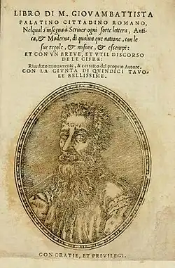Giovanni Battista Palatino (c. 1515 - c. 1575), also known as Giambattista, was an Italian calligrapher. He was born in Rossano, Calabria, but moved to Rome as a young man. In 1538, Palatino acquired Roman citizenship, much to his pride. Palatino's Libro nuovo d'imparare a scrivere is the best-known Renaissance treatise on calligraphy. He dedicated it to the Academia dello sdegno (Academy of the Disdainful), of which he was secretary.[1] As a calligrapher, Palatino was fascinated by ciphers and generally by the metamorphosis of the alphabet.[2] The serif typeface designed by Hermann Zapf and released in 1948 was named after Giambattista Palatino.