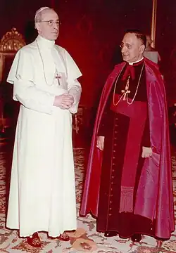 In March 1962, having suffered from poor health for several years, he was transferred to the Roman Curia and was promoted to the rank of cardinal priest in the consistory of 19 March 1962, with the Basilica of Santa Teresa d'Avila as his titular church.[7] He then founded the Cardinale Giovanni Panico Hospital in his native Tricase, where he soon died at age 67.[1]