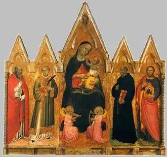 Giuliano di Simone (late 14th century - early 15th century) was an Italian painter, active near Lucca and Pisa in a late Gothic-style.[1] He worked in a style reminiscent of Spinello Aretino. Giuliano is known for only one signed work, an Enthroned Madonna and Child (1389) located in the church of San Michele in Castiglione di Garfagnana.[2]