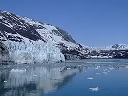 The Margerie Glacier is a 21 miles (34 km) long tide water glacier that begins on the south slope of Mount Root, at the Alaska-Canada border in the Fairweather Range (elevation above 9,000 feet (2,700 m)), and flows southeast and northeast to Tarr Inlet, one mile (1.6 km) north of the terminus of Grand Pacific Glacier and 87 miles (140 km) northwest of Hoonah. It was named for famed French geographer and geologist Emmanuel de Margerie (1862–1953), who visited Glacier Bay in 1913.[25][29] Located at the deep end of the Glacier Bay, Margerie Glacier extends over a width of about 1 mile (1.6 km) and extends upstream for a length of 21 miles (34 km) till its source on the southern slopes of the hill of Mount Root, at the Alaska-Canada border. Mount Root (elevation 12,860 feet (3,920 m)), named Boundary Peak 165, is a mountain in Alaska and British Columbia, is part of the Fairweather Range of the Saint Elias Mountains.