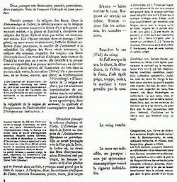 Allan Megill described the text as a "literary-philosophical collage."[5] Typography is an important part of the text's presentation and argument; the English translation was designed by Richard Eckersley, noted for his renderings of deconstructionist texts.[6] Gregor Dotzauer, writing for Der Tagesspiegel, argues that the two columns are explicitly phallic symbols, opposing each other in a power struggle that neither can win.[7] Literary theorist Susan Handelman has described the book's structure as being reminiscent of the format of the Talmud.[8]