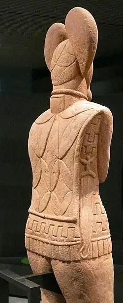 The figure has a moustache and wears a torc with three pendants, remarkably similar to the one from the chamber in mound 1, with several rings on both arms and one on the right hand. On his head, he wears a "leaf crown", or hood-like headdress crowned by two protrusions, resembling the shape of mistletoe leaves. Such headdresses are also known from a handful of contemporary sculptures, and coins. As mistletoe is believed to have held a magical or religious significance to the Celts, it could indicate that the individual depicted also played the role of a priest or druid.[20] Short swords similar to that depicted on the statue have been found across central and western Europe, with lunar symbols on their blades that are thought to represent different stages of the lunar cycle or lunar eclipses.[21][22] These swords have been associated with a priestly class, or druids, who had a knowledge of astronomy.[23][24] Similarities between these symbols and the later Coligny calendar have also been suggested.[25]