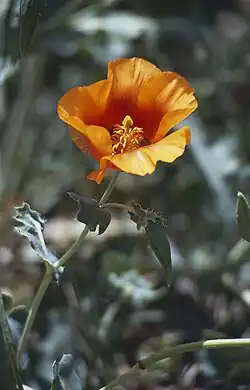 The species is a perennial flowering plant which has scalloped, blue-gray leaves. It flowers in the summer and fall with orange-red flowers that are 4 centimetres (1.6 in) in diameter. These flowers are on long stems which extend above the plant's foliage. The seed pods ripen in late summer.[2]