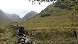 Glen Coe was once part of the lands of Clan Donald, though since the ending of the clan structure they progressively sold off their estates. Excavations in 2018-2020 conducted by the National Trust for Scotland have investigated the settlement of Achtriochtan and a reconstruction 'turf-house' was constructed at the NTS visitor centre to allow visitors to experience life in these townships. Further excavations and surveys in 2021-2022 in Gleann Leac-na-Muidhe, directed by Dr Edward Stewart of the University of Glasgow, investigated this shieling landscape, and uncovered features including charcoal burning platforms, peat cuttings, shieling huts, a whisky stilling site and a chiefly hunting lodge.[22] The hunting lodge site was investigated in 2023 by a University of Glasgow Field School directed by Dr Stewart.[23] In 2024 excavations around the settlement of Achnacon, co-directed by Dr Stewart and Derek Alexander of the NTS uncovered further evidence both of the events of the Massacre of Glencoe, and of daily life, subsistence practices and long-distance connections in Glencoe.[24] This site is linked to the settlement of Achnacon, excavated in 2024, by the new Glencoe Greenway Path. Recent work by Lizzie Robertson of the University of Glasgow has explored the creation of soundscapes and audio-installations exploring the complex history, folklore and environment of Glencoe and presenting this to new audiences.[25] These excavations featured in an episode of History Hit, which was launched in November 2024.