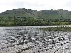 Glencar Lough lies in the Glencar Valley, between the Dartry Mountains to the north and the mountain range including Cope's Mountain to the south. The lake is located about 10 kilometres (6 mi) northeast of Sligo and about fifteen kilometres (9 mi) west of Manorhamilton. It is 2.5 km (1.6 mi) long from west to east and 0.6 km (0.4 mi) wide.[2] The lake has two crannogs (artificial islands): one at the western end near the Drumcliff River outlet and the other at the eastern end near the Diffreen River.[3]