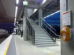 Recently upgraded platforms 1 and 2 of Glenfield station, with stairways leading to an overhead concourse.