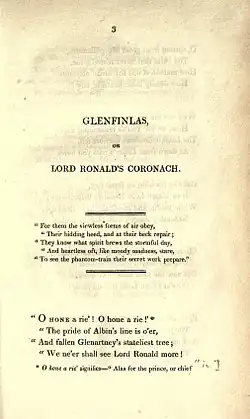 “Glenfinlas; or, Lord Ronald's Coronach” by Walter Scott, written in 1798 and first published in 1800, was, as Scott remembered it, his first original poem as opposed to translations from the German.[1] A short narrative of 264 lines, it tells a supernatural story based on a Highland legend. Though highly appreciated by many 19th century readers and critics it is now overshadowed by his later and longer poems.
