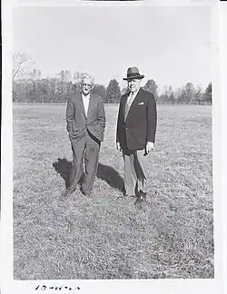 Control of Angel Mounds is transferred to the state of Indiana in 1946.[4][20] but the Indiana Historical Society retained rights to excavate the site and Black remained on the property as its caretaker.[6][24] Between 1958 and 1962, two National Science Foundation grants provided financial support to Black's efforts to apply geophysical applications to archaeological sites. Black and his student assistants tested a proton magnetometer's potential use in locating subsurface features at archaeological sites, extending the work begun by the University of Oxford's Research Laboratory for Archaeology and the History of Art. Black and his students traced segments of the palisade walls at Angel Mounds that were not visible from the surface.[6][25] This project made Black among the first prehistorians to make "comprehensive tests in the Americas" to assess the proton magnetometer's potential on a New World site.[7][17] Angel Mounds was designated a National Historic Landmark in 1964.[10] In addition, his innovative excavation techniques were partially adopted by the University of Chicago Field School, one of the few training programs in archaeological field techniques in the United States in the first half of the 20th century.[19]