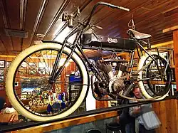 Curtiss began his career as a Western Union bicycle messenger, a bicycle racer, and bicycle-shop owner. In 1901, he developed an interest in motorcycles when internal-combustion engines became more available. In 1902, Curtiss began manufacturing motorcycles with his own single-cylinder engines. His first motorcycle's carburetor was adapted from a tomato soup can containing a gauze screen to pull the gasoline up by capillary action.[5][6][7] In 1903, he set a motorcycle land speed record at 64 miles per hour (103 km/h) for one mile (1.6 km). When E.H. Corson of the Hendee Mfg Co (manufacturers of Indian motorcycles) visited Hammondsport in July 1904, he was amazed that the entire Curtiss motorcycle enterprise was located in the back room of the modest "shop". Corson's motorcycles had just been trounced the week before by "Hell Rider" Curtiss in an endurance race from New York to Cambridge, Maryland.[8]