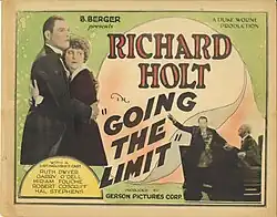 Going the Limit is a 1925 American silent drama film directed by Duke Worne and starring Ashton Dearholt, Ruth Dwyer and Garry O'Dell.[1] It was shot at studios in San Francisco.