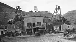 A group of miners pose in front of mine headframe in Goldfield c. 1905